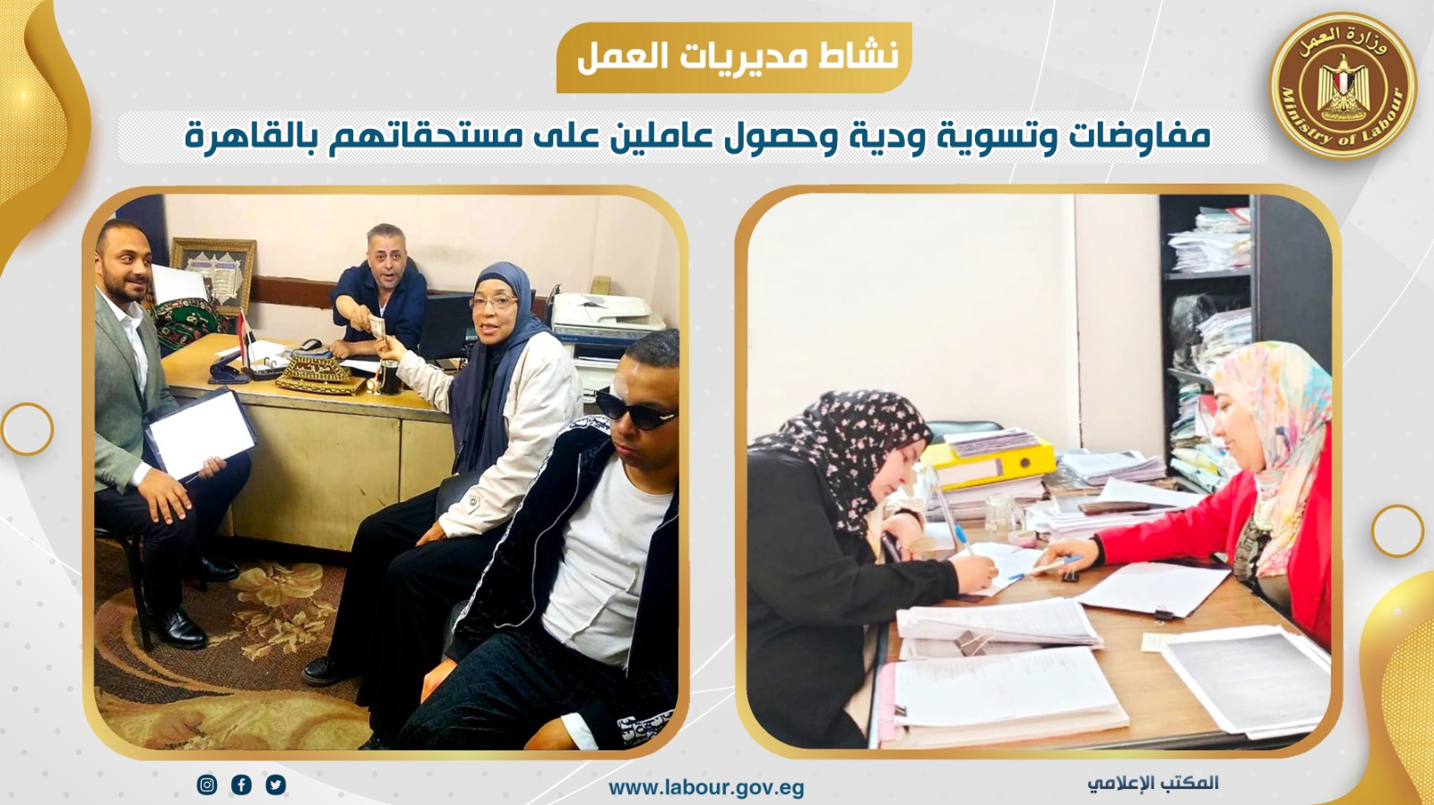 أعلنت مديرية عمل القاهرة عن نجاح عملية تسوية وديّة بمكتب 15مايو والمعادي والتبين، دون اللجوء إلى القضاء، وذلك بعد تقدمت العاملة دينا عبد البديع بشكوى لمكتب العلاقات ضد شركة مايتكس للملابس، حيث قام المكتب بعقد سلسلة من المفاوضات مع مسئولي الشركة، وتمت التسوية ودياً وتحت إشراف الإدارة المركزية لرعاية القوى العاملة بالوزارة.