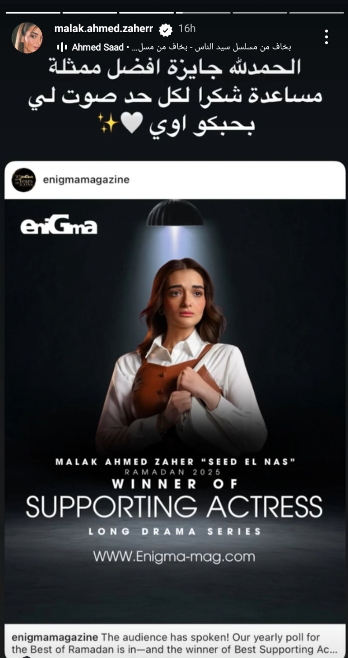وحرصت ملك أحمد زاهر علي توجيه رسالة شكر لجمهورها، وكتبت من خلال حسابها الرسمي عبر موقع تبادل الصور والفيديوهات القصيرة إنستجرام، عبر خاصية استوري، وقالت: "الحمد لله جائزة افضل ممثلة مساعدة.. شكرا لكل حد صوت لي.. بحبكو اوي".
