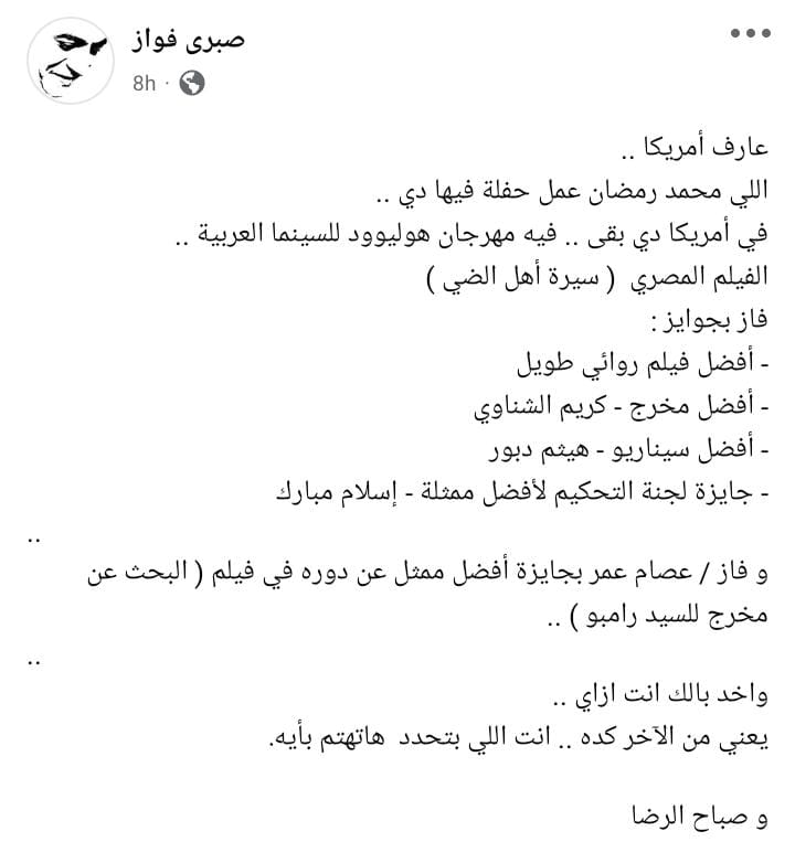 وتابع: “و فاز / عصام عمر بجايزة أفضل ممثل عن دوره في فيلم ( البحث عن مخرج للسيد رامبو ) ”.