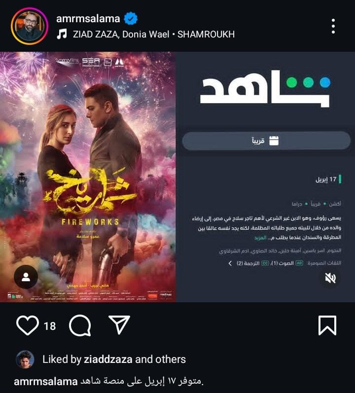 أعلن المخرج عمرو سلامة عن عرض فيلم شماريخ علي منصة شاهد الرقمية في يوم الخميس المقبل الموافق 17 أبريل، وذلك من خلال حسابه الرسمي عبر موقع تبادل الصور والفديوهات القصيرة “إنستجرام”، وعلق: “متوفر 17 أبريل علي منصة شاهد”.