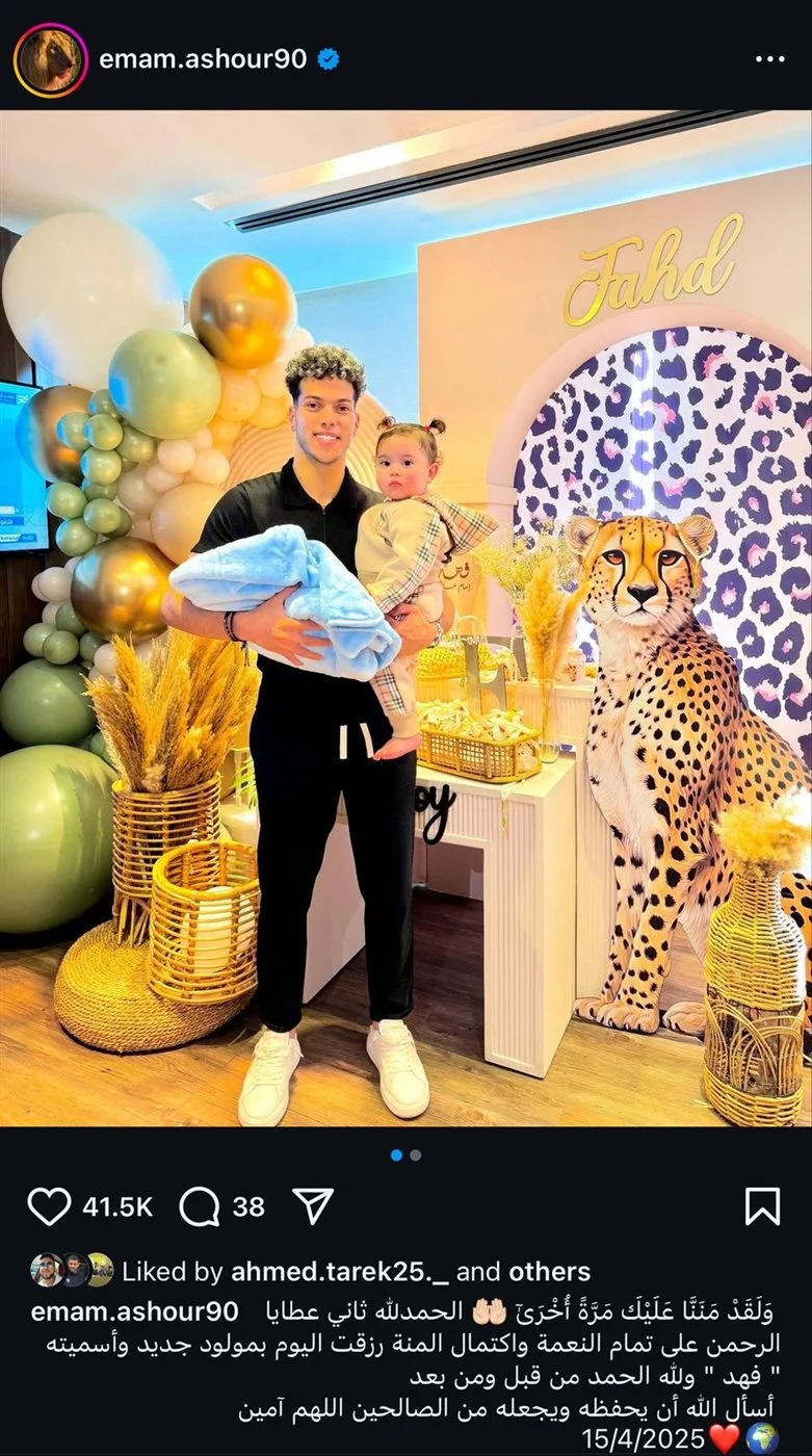 احتفل إمام عاشور لاعب الفريق الأول لكرة القدم بالنادي الأهلى بمولوده الثاني، والذي أطلق عليه اسم "فهد".