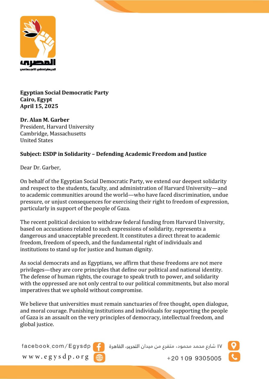 أعلن الحزب المصري الديمقراطي الاجتماعي في خطاب رسمي موجه لإدارة جامعة هارفارد تضامنه الكامل مع الجامعة، طلابها، أعضاء هيئتها التدريسية، وكل الأكاديميين حول العالم، ممن يواجهون تمييزًا وضغوطًا بسبب مواقفهم الداعمة للشعب الفلسطيني وحقهم في حرية التعبير.