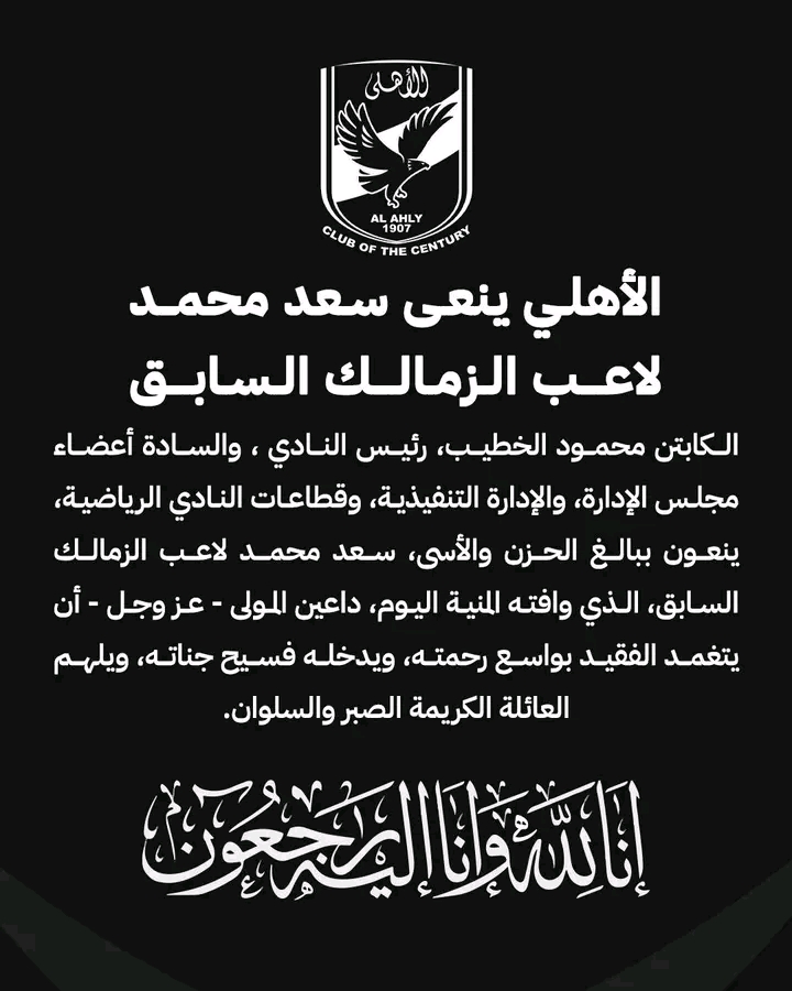 نعى الكابتن محمود الخطيب، رئيس النادي الأهلي، وأعضاء مجلس الإدارة، والإدارة التنفيذية، وقطاعات النادي الرياضية، ببالغ الحزن والأسى، سعد محمد لاعب الزمالك السابق، الذي وافته المنية اليوم، داعين المولى - عز وجل - أن يتغمد الفقيد بواسع رحمته، ويدخله فسيح جناته، ويلهم العائلة الكريمة الصبر والسلوان.