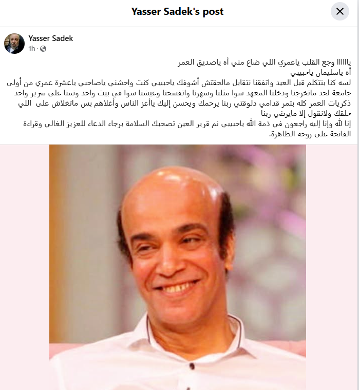 ياسر صادق ناعيا سليمان عيد:"ياااااا وجع القلب مالحقتش أشوفك"