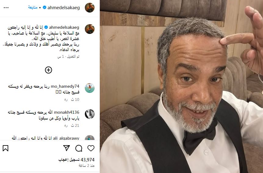 نعى النجم أحمد السقا الفنان الراحل سليمان عيد الذي وافته المنية صباح اليوم الجمعة إثر تعرضه لأزمة صحية مفاجئة، نقل على أثرها إلى المستشفى، لكنه لفظ أنفاسه الأخيرة وفارق الحياة.