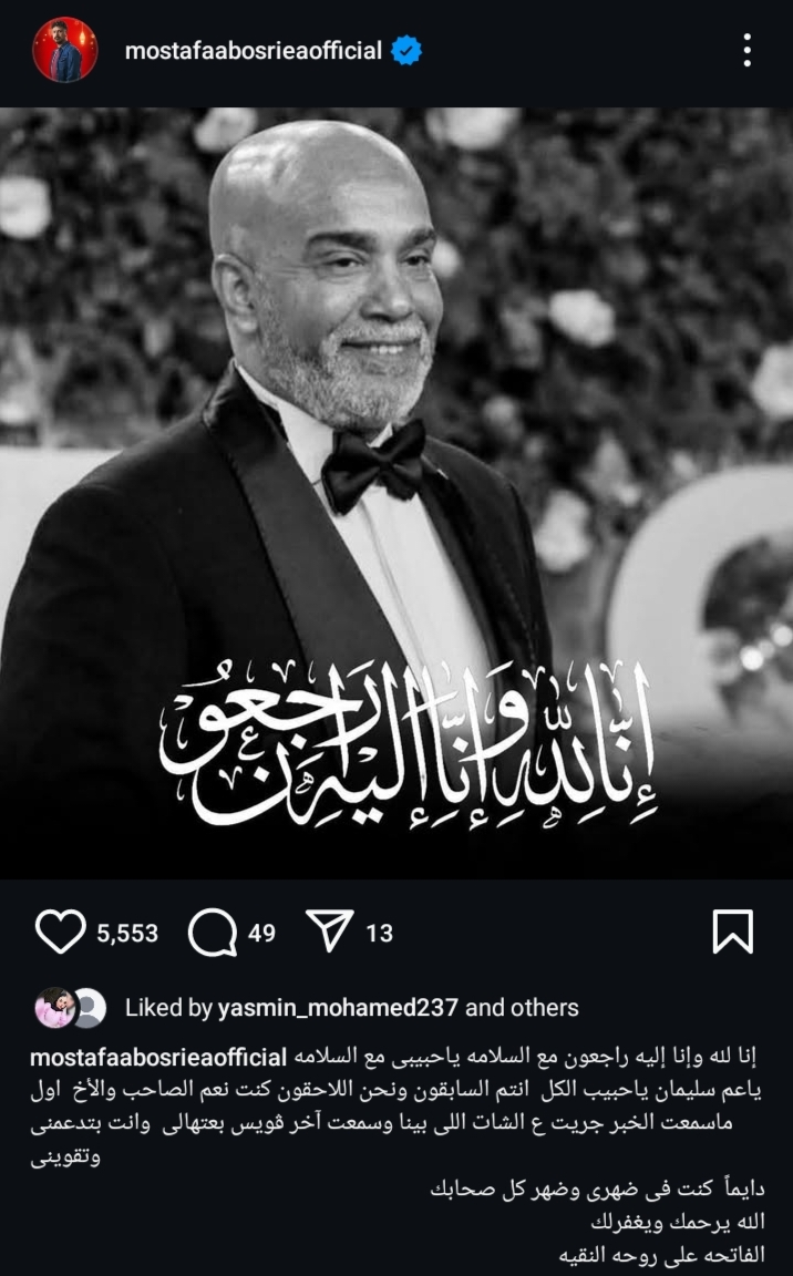 ونشر مصطفي أبو سريع صورة للفنان سليمان عيد، من خلال حسابه الرسمي عبر موقع تبادل الصور والفديوهات القصيرة إنستجرام، وعلق: "إنا لله و إنا إليه راجعون مع السلامة يا حبيبي مع السلامة يا عم سليمان يا حبيب الكل انتم السابقون و نحن اللاحقون كنت نعم الصاحب و الأخذ".