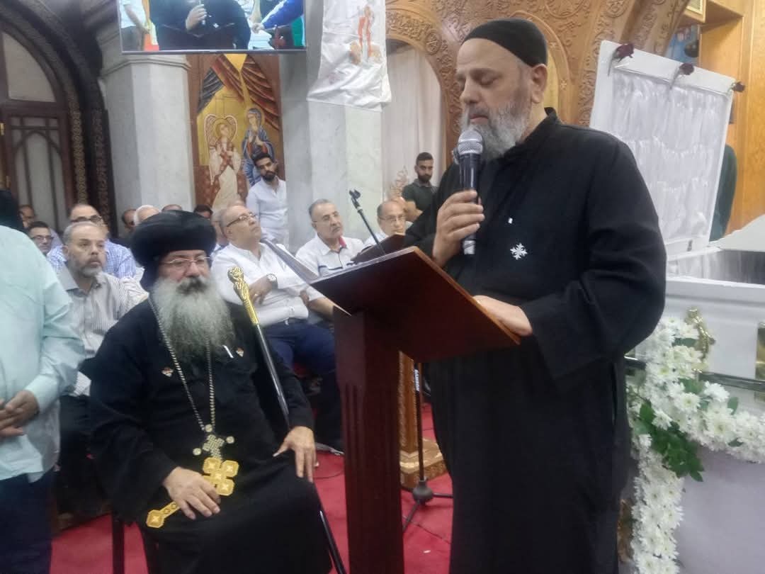وشارك في صلاة الجنازة مجموعة كبيرة من الأباء الكهنة، وخورس شمامسة الكنيسة بقيادة المرتل مينا عيد، والخدام والخادمات بقيادة جورج كمال أمين عام التربية الكنسية، بحضور إيهاب العمدة وعمر وطني عضوي مجلس النواب، وعدد من القيادات الشعبية والتنفيذية وممثلي عن عدد من الأحزاب، فيما نقل القمص جرجس كلمة التعزية التى بعثها قداسة البابا تواضروس الثاني، وقدم كلمة الشكر للحضور القس مرقس جرجس كاهن الكنيسة.