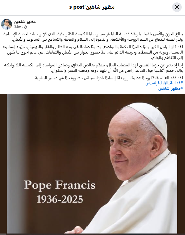 وقال مظهر شاهين عبر صفحته الرسمية على فيسبوك: ببالغ الحزن والأسى تلقينا نبأ وفاة قداسة البابا فرنسيس، بابا الكنيسة الكاثوليكية، الذي كرّس حياته لخدمة الإنسانية، ونذر نفسه للدفاع عن القيم الروحية والأخلاقية، والدعوة إلى السلام والمحبة والتسامح بين الشعوب والأديان.