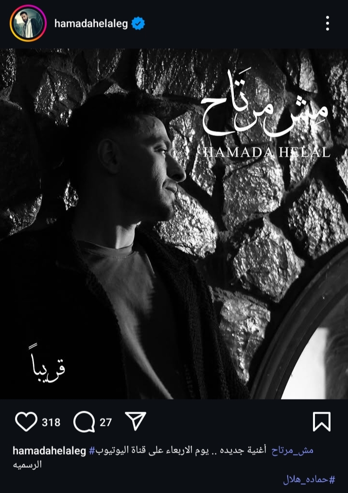 ونشر حماده هلال البوستر الخاص بالأغنية من خلال حسابه الرسمي عبر موقع تبادل الصور والفديوهات القصيرة إنستجرام، وعلق:" مش مرتاح أغنية جديدة.. يوم الأربعاء علي قناة اليوتيوب الرسمية".