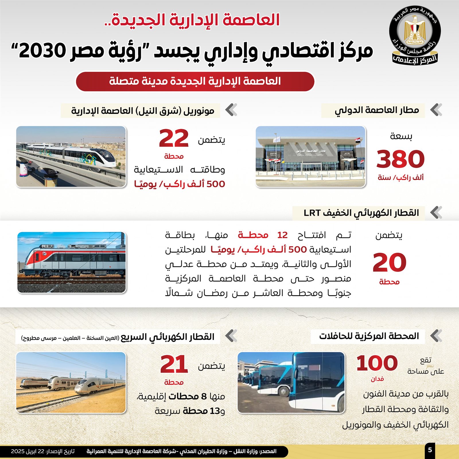 وأشارت الإنفوجرافات إلى أن العاصمة الإدارية مدينة متصلة تشمل مطار العاصمة الدولي بسعة 380 ألف راكب/ سنويًا، وكذلك القطار الكهربائي الخفيف LRT، الذي يتضمن 20 محطة، تم افتتاح 12 محطة منها، بطاقة استيعابية 500 ألف راكب/يوميًا للمرحلتين الأولى والثانية، ويمتد من محطة عدلي منصور حتى محطة العاصمة المركزية جنوبًا، ومحطة العاشر من رمضان شمالًا، كما تشمل المدينة مونوريل (شرق النيل) العاصمة الإدارية، والذي يتضمن 22 محطة وطاقته الاستيعابية 500 ألف راكب/يوميًا، بالإضافة إلى القطار الكهربائي السريع (العين السخنة – العلمين – مرسى مطروح)، الذي يتضمن 21 محطة منها 8 محطات إقليمية، و13 محطة سريعة، كذلك تضم المحطة المركزية للحافلات، التي تقع على مساحة 100 فدان بالقرب من مدينة الفنون والثقافة ومحطة القطار الكهربائي الخفيف والمونوريل.