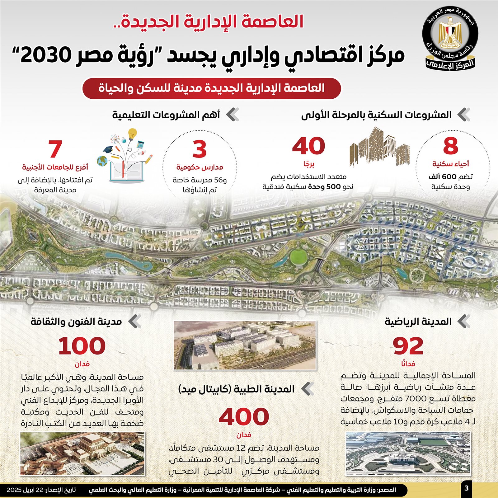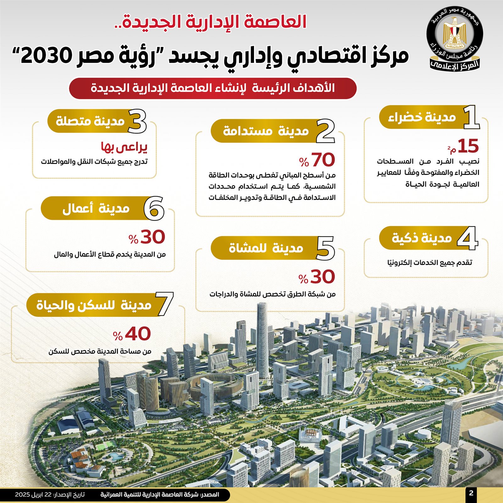 وتناولت الإنفوجرافات، رؤية العاصمة الإدارية الجديدة، التي تم تصميمها لتكون مدينة متكاملة بها مناطق للإسكان والعمل، وتقدم كافة الخدمات التعليمية والصحية والترفيهية، وتضم المقرات الرئيسة للوزارات ومجلس الوزراء ومجلس الشيوخ والبرلمان، فضلًا عن مقرات البنوك المحلية والدولية والمؤسسات المالية والبنك المركزي المصري.