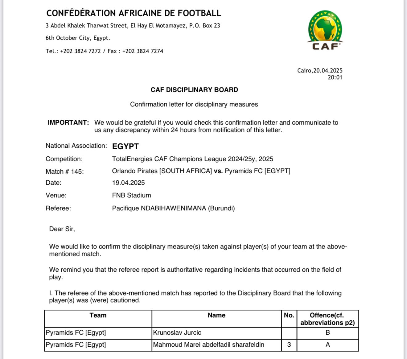 أضاف المصدر أن طاقم الحكام خضع للتحقيق من جانب مسئولي لجنة الحكام في الكاف، بسبب الأخطاء الجسيمة التي ارتكبها الحكام في المباراة من فوضى في الإنذارات بالملعب وإلغاء هدفين سجلهما بيراميدز في شباك أورلاندو بداعي التسلل ولمسة يد، أحدهما صحيح وفقا لقانون اللعبة، والآخر يترك لتقدير الحكم، ولكن الحكم وطاقم الفار تدخلا بشكل خاطئ وحرما بيراميدز من فوز كبير خارج الأرض.