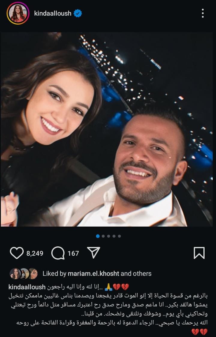 ونشرت كندة علوش صور تجمعها بالإعلامي الراحل صبحي عطري، من خلال حسابها الرسمي عبر موقع تبادل الصور والفديوهات القصيرة “إنستجرام”، ونعته بكلمات حزينة ومؤثرة، وقالت: “إنا لله و أنا اليه راجعون، بالرغم من قسوة الحياة إلا إنو الموت قادر يفجعنا ويصدمنا بناس غاليين ما ممكن نتخيل يمشوا هالقد بكير.. انا ما عم صدق وما رح صدق رح اعتبرك مسافر متل دائمًا، ورح تبعتلي وتحاكيني بأي يوم وشوفك و نلتقي و نضحك من قلبنا”.