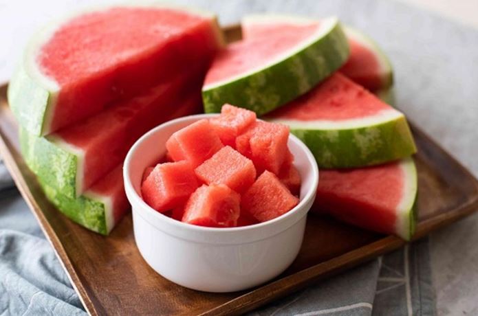 - قومى بتقطيع البطيخ إلى قطع خالية من البذور، ومقسمة إلى مكعبات. .
