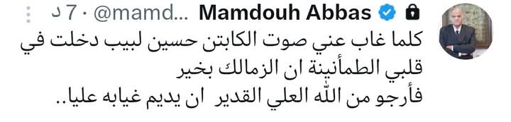 وكتب ممدوح عباس عبر حسابه الرسمي على منصة اكس:«كلما غاب عني صوت الكابتن حسين لبيب دخلت في قلبي الطمأنينة أن الزمالك بخير».
