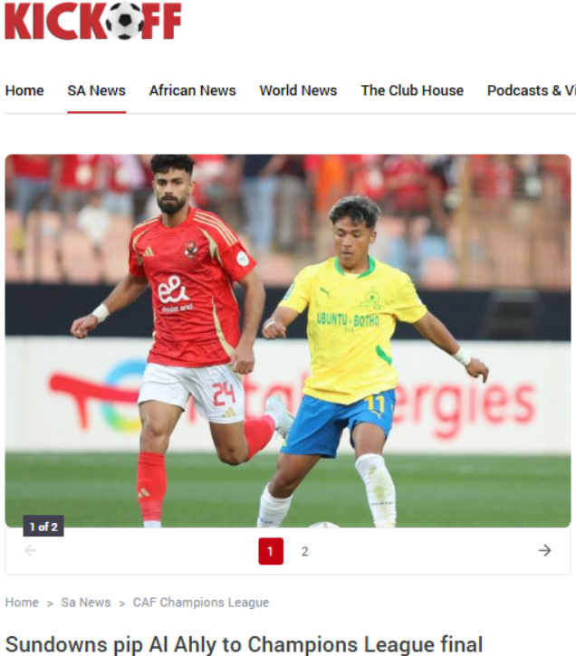 وقالت صحيفة “كيك أوف” الجنوب إفريقية: “صن داونز يهزم الأهلي ويتأهل لنهائي دوري أبطال إفريقيا”.
