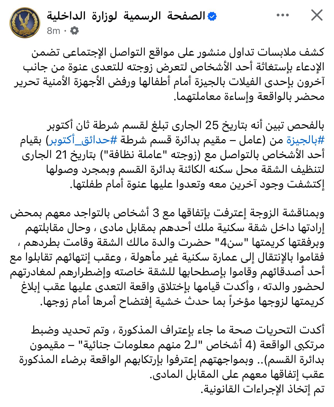كشف وزارة الداخلية ملابسات تداول منشور على مواقع التواصل الإجتماعى تضمن الإدعاء باستغاثة أحد الأشخاص لتعرض زوجته للتعدى عنوة من جانب آخرون بإحدى الفيلات في أكتوبر بالجيزة أمام أطفالها ورفض الأجهزة الأمنية تحرير محضر بالواقعة وإساءة معاملتهما.