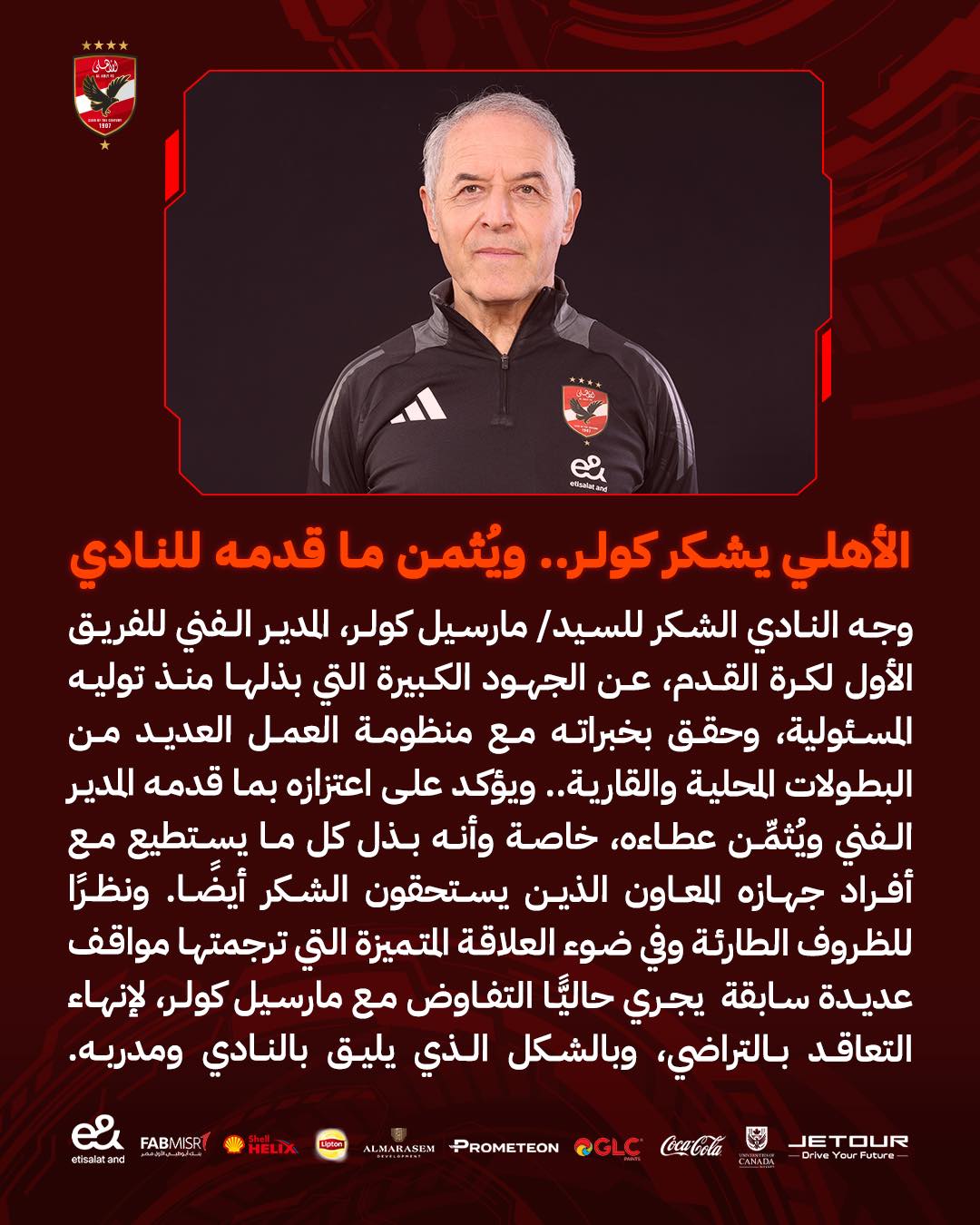 وجه النادي الأهلي الشكر للمدير الفني للفريق الأول لكرة القدم، مارسيل كولر، عن الجهود الكبيرة التي بذلها منذ توليه المسئولية وحقق بخبراته مع منظومة العمل العديد من البطولات المحلية والقارية.
