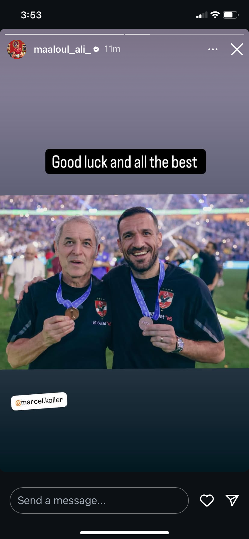 ونشر معلول صورة تجمعه بكولر عبر حسابه الشخصي على إنستجرام، مرفقًا إياها بتعليق: "كل التوفيق لك في خطواتك القادمة".