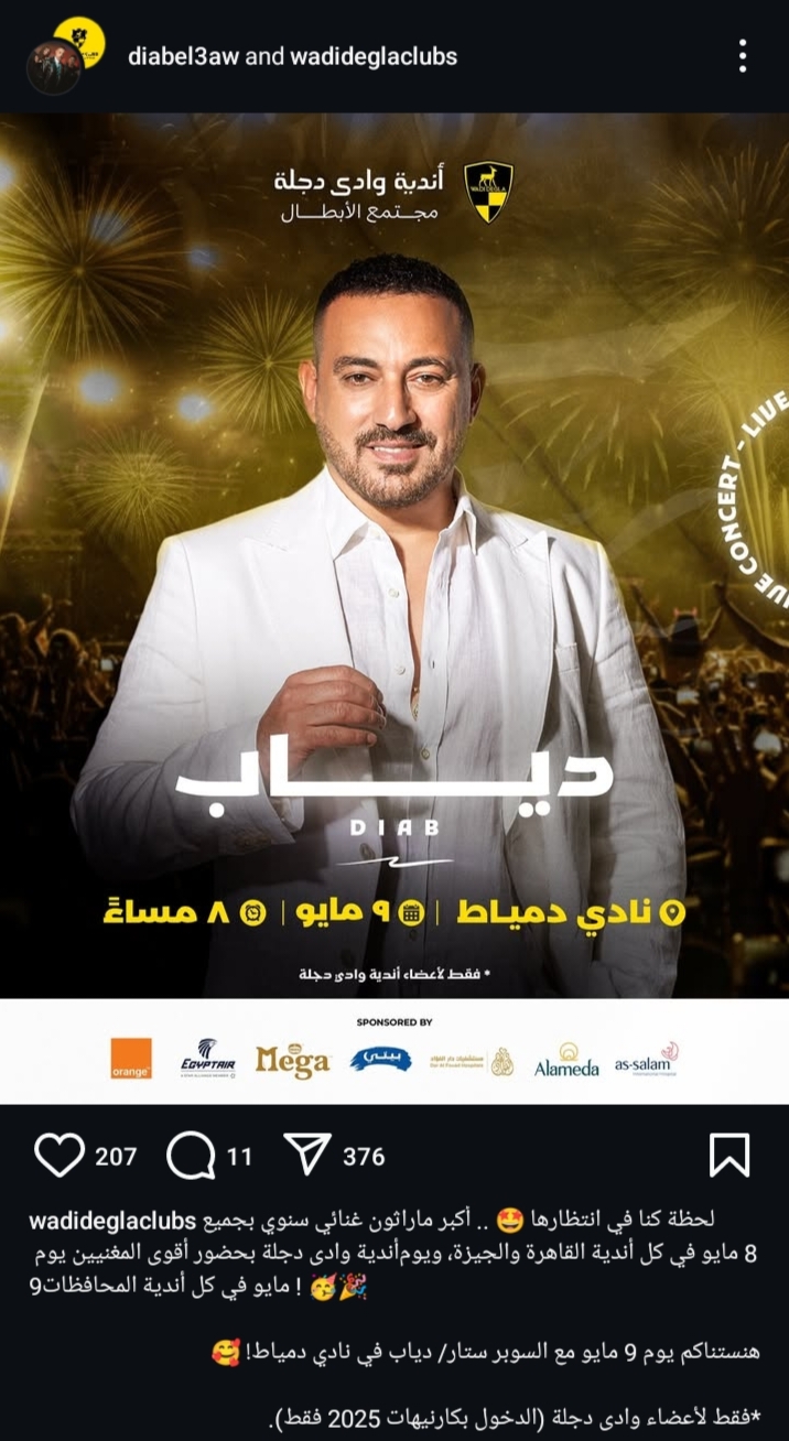 ومن المقرر إقامة حفل دياب في نادي دمياط يوم الجمعة الموافق 9 مايو من الشهر المقبل، وذلك في تمام الساعة 8:00 مساءً.