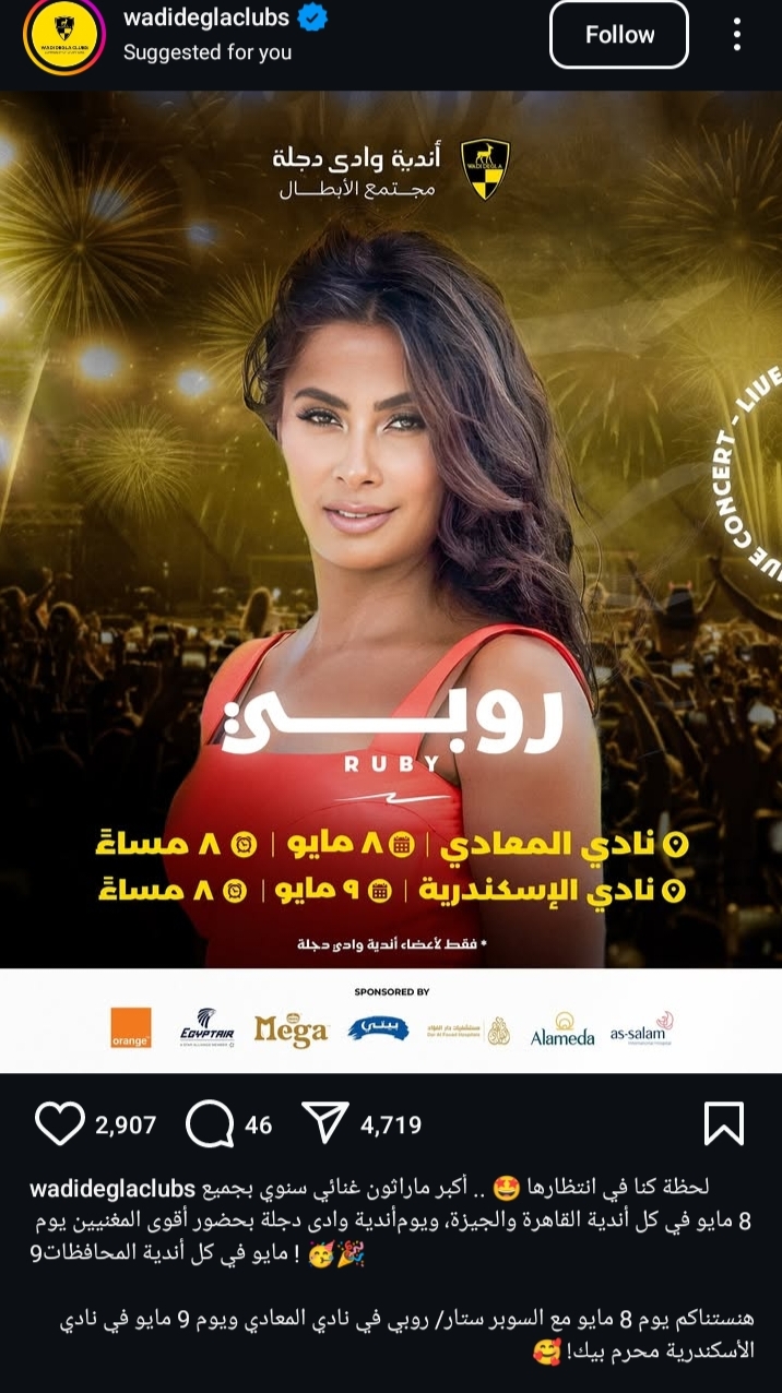 وأضاف:" هنستناكم يوم 8 مايو مع السوبر ستار روبي في نادي المعادي".