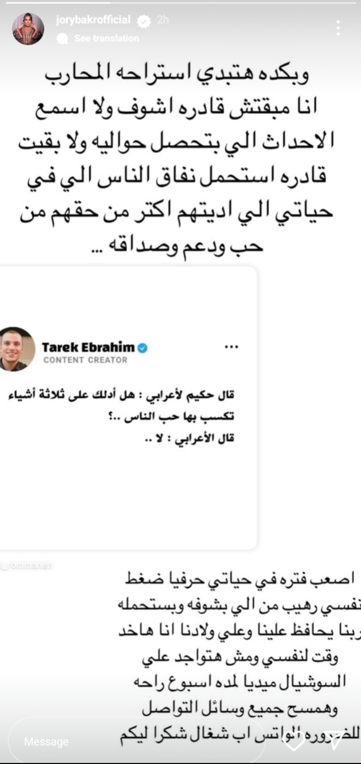 وكتبت جوري بكر من خلال حسابها الرسمي عبر موقع تبادل الصور والفديوهات القصيرة إنستجرام، عبر خاصية استوري، قالت: "وبكدة هبتدي استراحة المحارب، أنا مبقتش قادرة أشوف ولا أسمع الأحداث اللي بتحصل حواليا، ولا بقيت قادرة أستحمل نفاق الناس اللي في حياتي، اللي اديتهم أكتر من حقهم من حب ودعم وصداقة".
