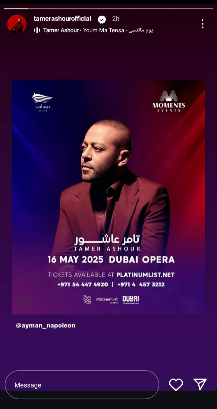ومن ناحية اخري، يستعد النجم تامر عاشور لـ إحياء حفل غنائي ضخم بالإسكندرية ضمن حفلات سلسلة الربيع، وذلك في إحدي الأكاديميات يوم الجمعة الموافق 9 مايو 2025.