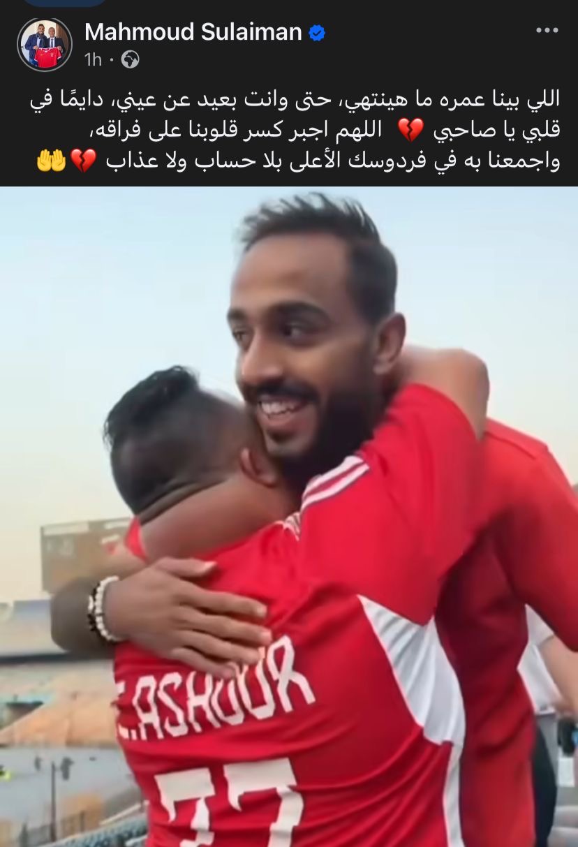 وقال كهربا: "إنا لله وإنا إليه راجعون توفي إلى رحمة الله أخويا وحبيبي محمد أحمد عبد الغني.. رحم الله قلبك الطيب..رحم الله بسمتك ووجهك البشوش..رحم الله روحك الجميلة.. نسأل الله أن يجعلك في جنات الفردوس".