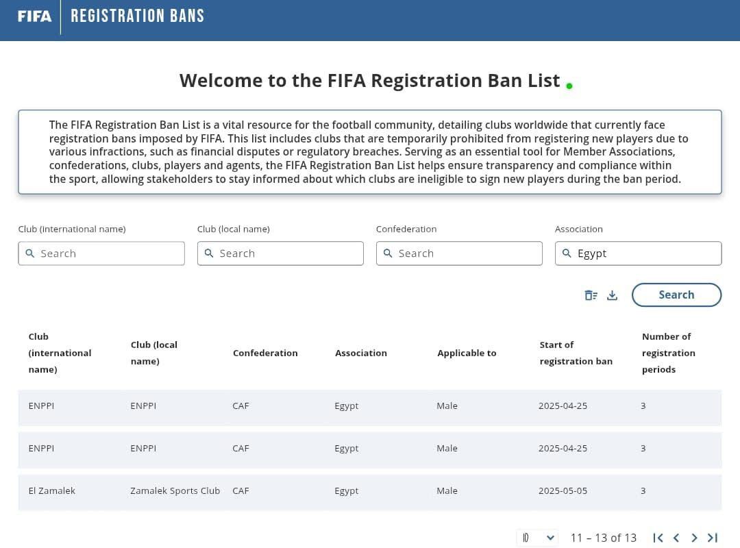 أصدر الاتحاد الدولي لكرة القدم فيفا قرارًا بإيقاف قيد نادي الزمالك لمدة 3 فترات أخرى؛ بسبب مستحقات جايمي باتشيكو مدرب الزمالك الأسبق.