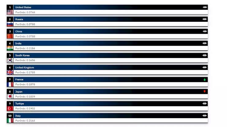 تصدر الجيش الأمريكي التصنيف العالمي بمؤشر قوة بلغ 0.0744، يليه الجيش الروسي والصيني بنفس المؤشر 0.0788، ثم الهند وكوريا الجنوبية والمملكة المتحدة وفرنسا واليابان وتركيا وإيطاليا وتظهر هذه الأرقام الفجوة بين القوى الكبرى وبقية الدول، إلا أن مصر تمكنت من الحفاظ على موقعها ضمن العشرين الأوائل.
