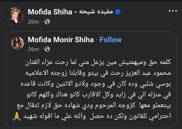 وقالت مفيدة على موقع التواصل الاجتماعي الفيسبوك: "كلمه حق وميهمنيش مين يزعل مني لما رحت عزاء الفنان محمود عبد العزيز رحت في بيتو وقابلنا زوجته الاعلاميه بوسي شلبي وده كان في وجود ولاده الاتنين وكانت قاعده في منزله الي في زايد وكل الاقارب كانو هناك وكلهم كانو بيتعملو معها كزوجه المرحوم ودي شهاده حق لازم تتقال مع احترامي للقانون ولكن ده حصل والله علي ما اقوله شهيد".