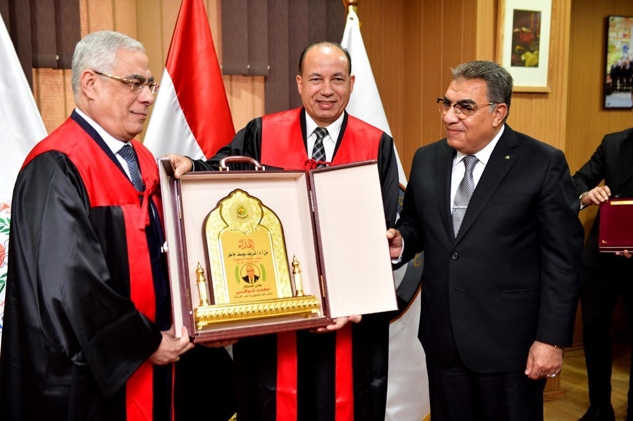 وخلال الفعاليات، سلّم رئيس الجامعة شهادة الدكتوراه الفخرية ودرع الجامعة للنائب العام، تقديرًا لجهوده المخلصة، بينما قدّم النائب العام درع النيابة العامة إلى رئيس الجامعة، تعبيرًا عن تقديره للدور العلمي والبحثي الرائد الذي تضطلع به الجامعة.