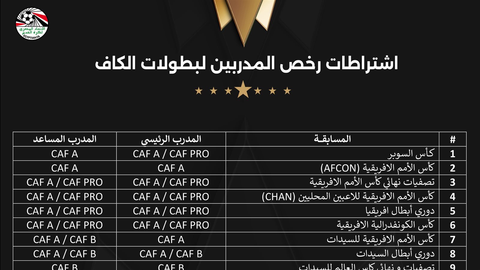 اعتمد المكتب التنفيذي للاتحاد الأفريقي لكرة القدم "كاف" متطلبات جديدة للمدربين، وأعلن دخولها حيز التنفيذ بدءًا من شهر مايو الحالي.