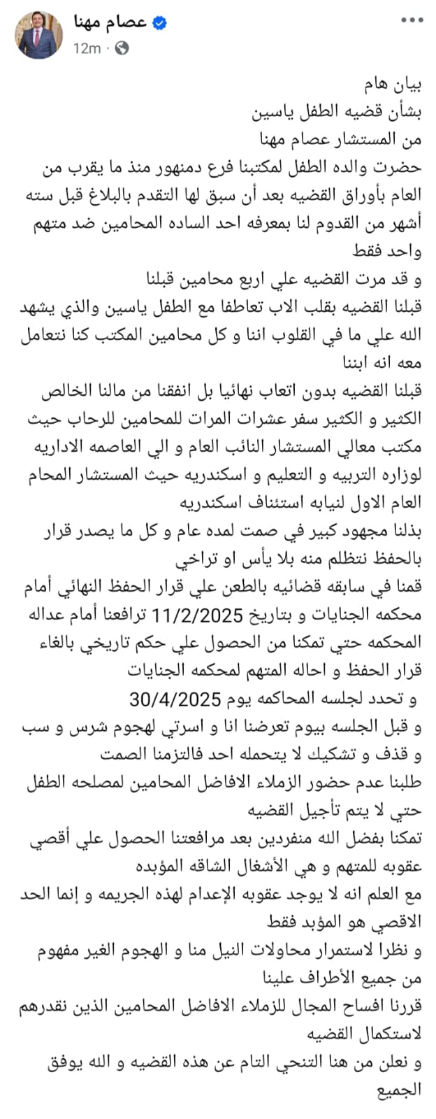 تنحي محامي أسرة الطالب ياسين عن استكمال القضية