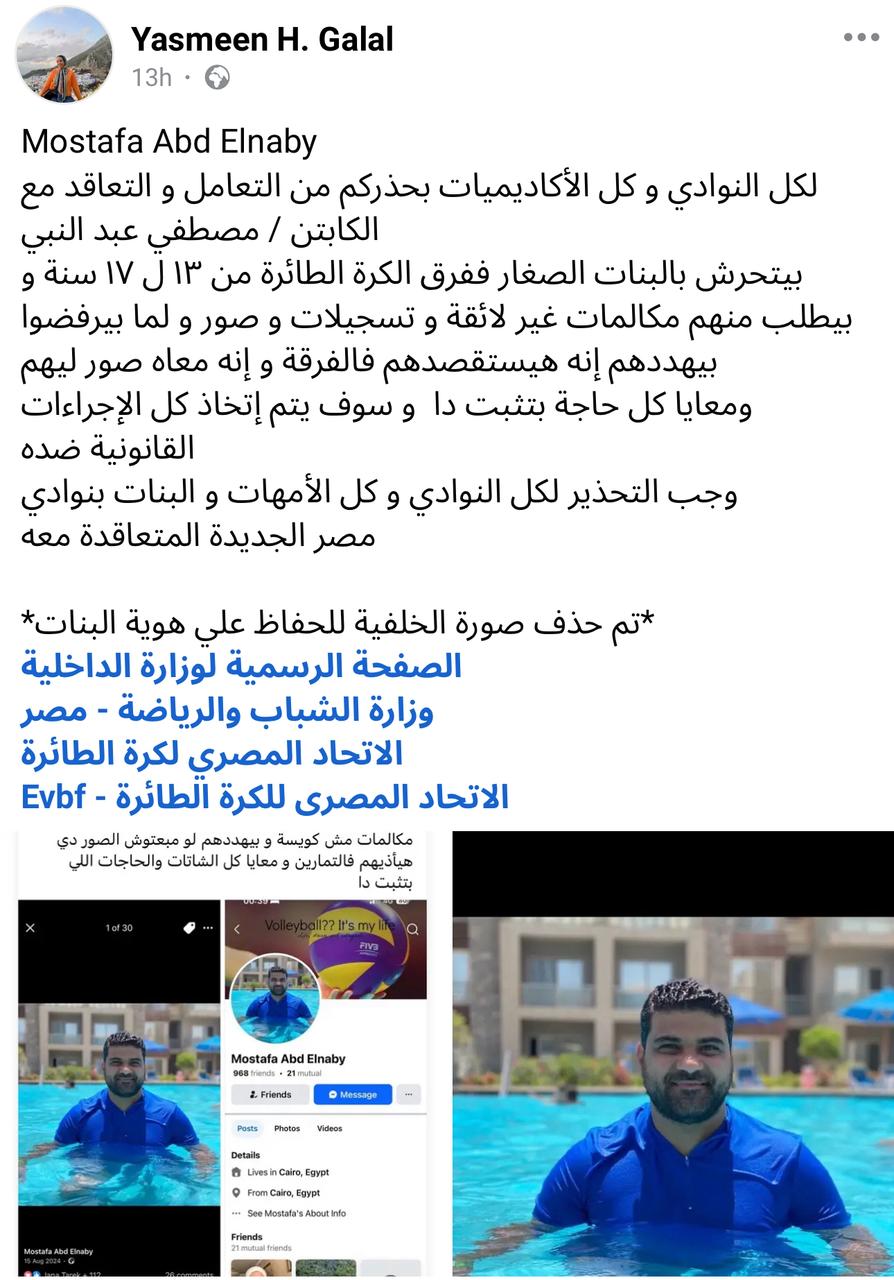 وتعود الواقعة إلى بلاغ نشرته سيدة تُدعى ياسمين عبر منصات التواصل، حذّرت فيه من التعامل مع مدرب الكرة الطائرة ، مشيرة إلى تورطه في وقائع تحرش بعدد من اللاعبات الناشئات، تتراوح أعمارهن بين 13 و17 عامًا، في عدد من الأندية الشهيرة بمنطقة مصر الجديدة.