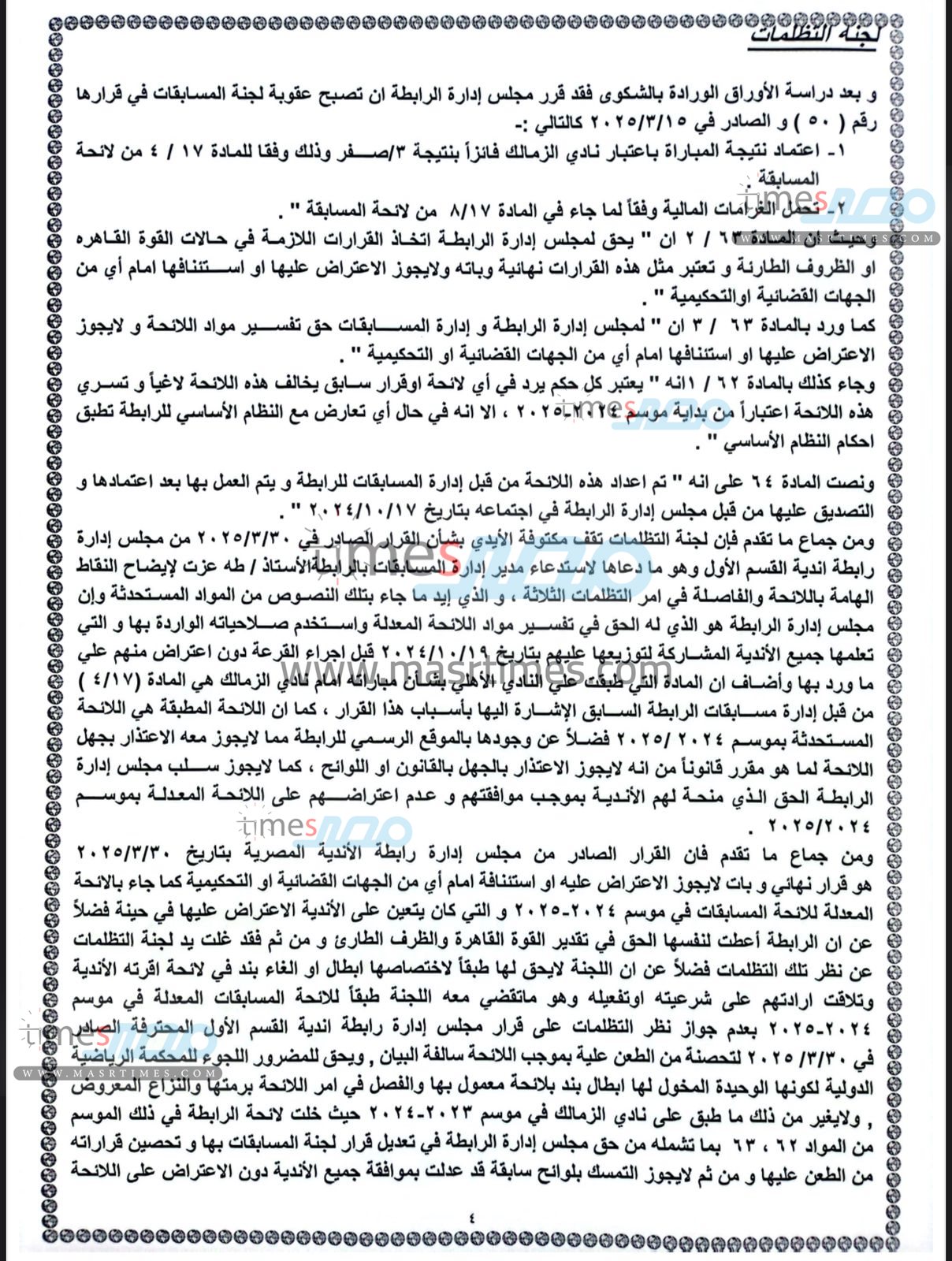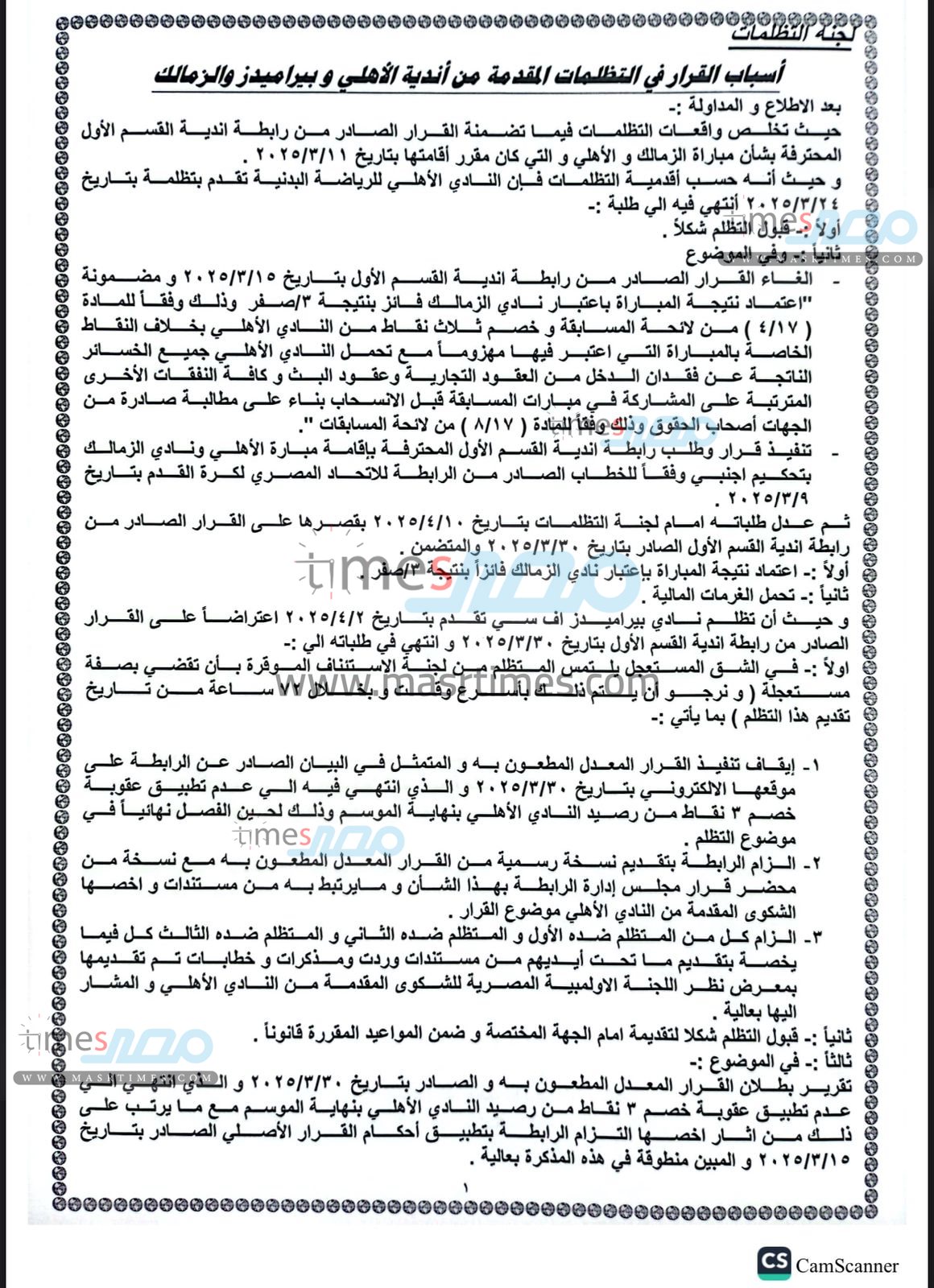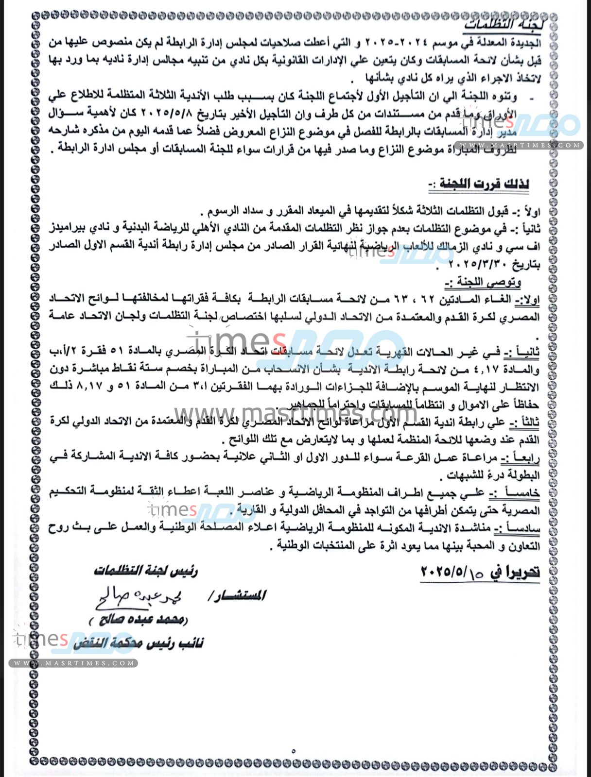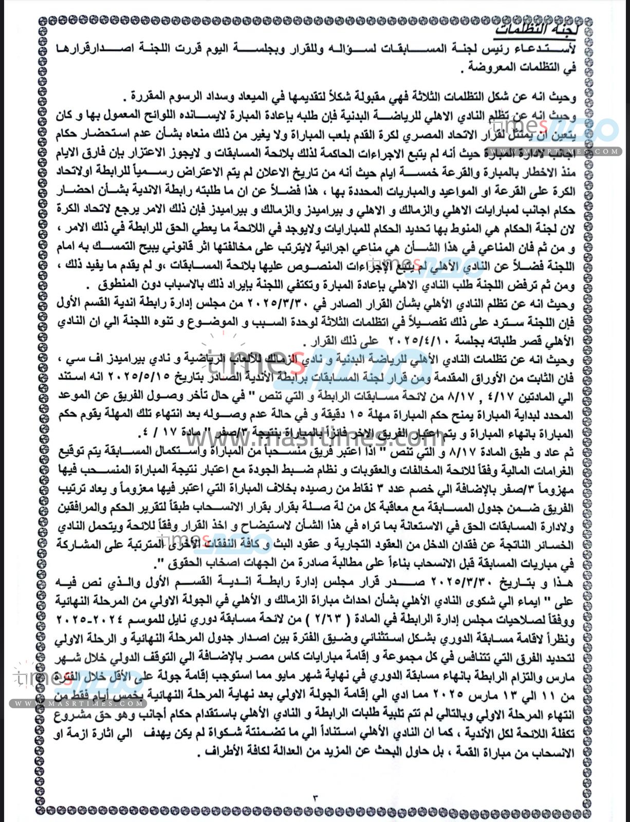 وقررت لجنة الاستئناف عدم جواز نظر التظلمات المقدمة من النادي الأهلي و بيراميدز اف سي و الزمالك لنهائية القرار الصادر من مجلس إدارة رابطة أندية القسم الأول الصادر بتاريخ 30 مارس 2025.