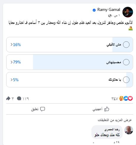 وكتب رامي عبر صفحته الرسمية "انستجرام"" الالبوم خلص وجاهز للنزول بعد العيد علطول ان شاء الله ومحتار بين ٣ أسامي ف اختارو معايا (مش لاقيكي / محسبتهاش/ يا حلاوتك ) اختارو معايا ".