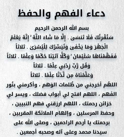 ربّ اشرح لي صدري، ويسر لي أمري، واحلل عقدةً من لساني، يفقهوا قولي، اللهم استودعك ما أتعلمه، فردّه إليّ عند حاجتي إليه، ولا تنسينه يا رب العالمين.