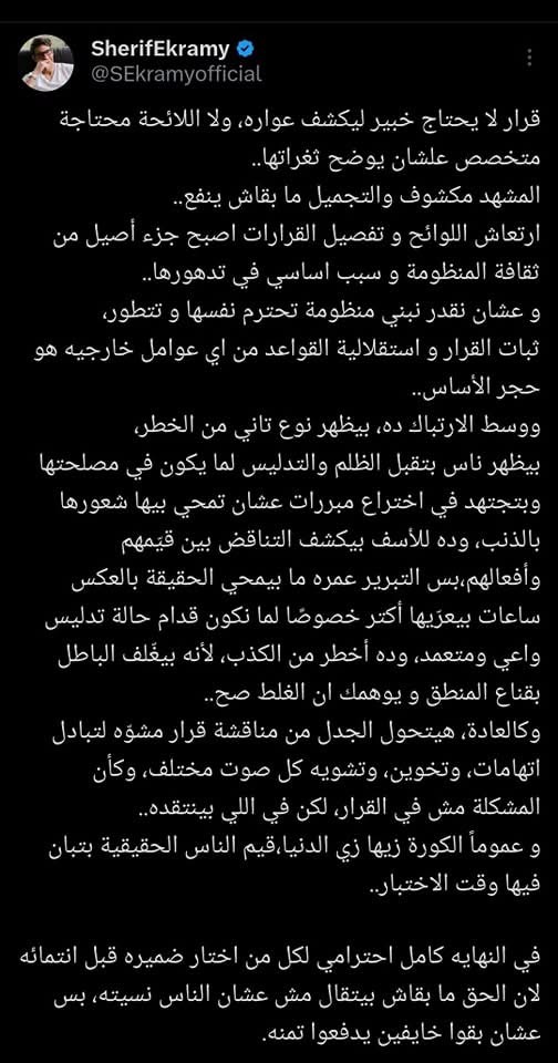 وكتب إكرامي: "قرار لا يحتاج خبير ليكشف عواره، ولا اللائحة محتاجة متخصص علشان يوضح ثغراتها.. المشهد مكشوف والتجميل مبقاش ينفع. ارتعاش اللوائح وتفصيل القرارات أصبح جزءا أصيلا من ثقافة المنظومة وسببا أساسيا في تدهورها.. وعشان نقدر نبني منظومة تحترم نفسها وتتطور، ثبات القرار واستقلالية القواعد من أي عوامل خارجية هو حجر الأساس".