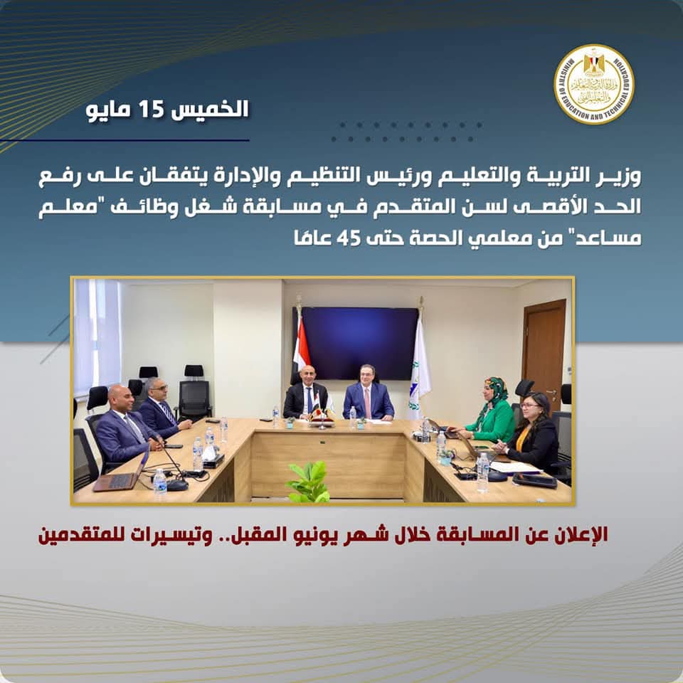 اتفق السيد محمد عبداللطيف، وزير التربية والتعليم والتعليم الفني، والمهندس حاتم نبيل، رئيس الجهاز المركزي للتنظيم والإدارة، على رفع الحد الأقصى لسن المتقدم في مسابقة شغل وظائف "معلم مساعد" من معلمي الحصة إلى 45 عامًا، كما اتفقا على أن يعلن الجهاز عن المسابقة خلال شهر يونيو المقبل.