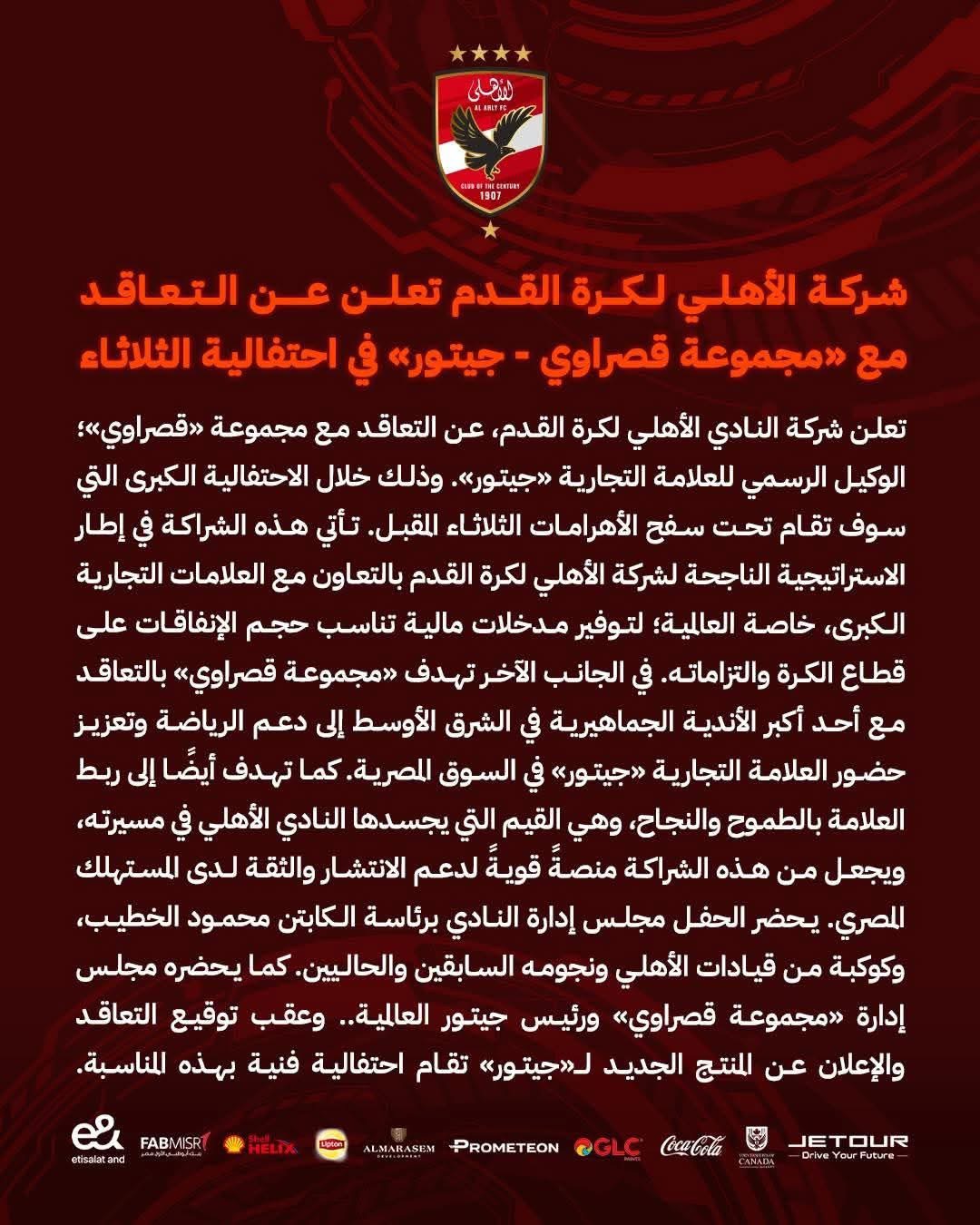 وذلك خلال الاحتفالية الكبرى التي سوف تقام تحت سفح الأهرامات الثلاثاء المقبل. تأتي هذه الشراكة في إطار الاستراتيجية الناجحة لشركة الأهلي لكرة القدم بالتعاون مع العلامات التجارية الكبرى، خاصة العالمية؛ لتوفير مدخلات مالية تناسب حجم الإنفاقات على قطاع الكرة والتزاماته.