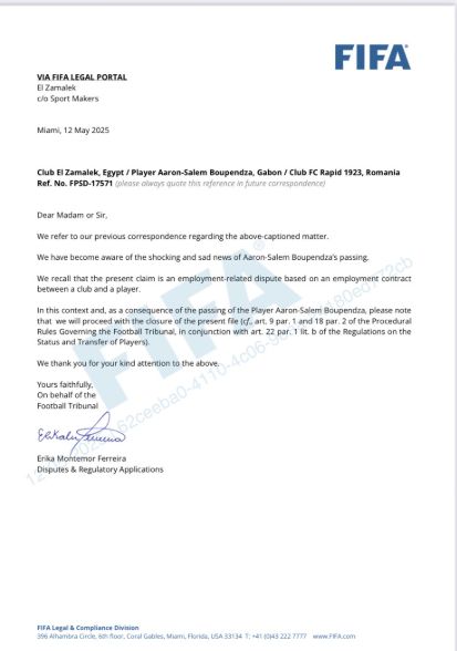 ونشر أدهم عبر حسابه الرسمي على منصة "إكس" صورة من خطاب "فيفا"، وعلّق قائلًا: "إلى كل من شكك في موقف نادي الزمالك بخصوص قضية اللاعب، أضع بين أيديكم المستند الرسمي الذي يؤكد إغلاق الملف نهائيًا".