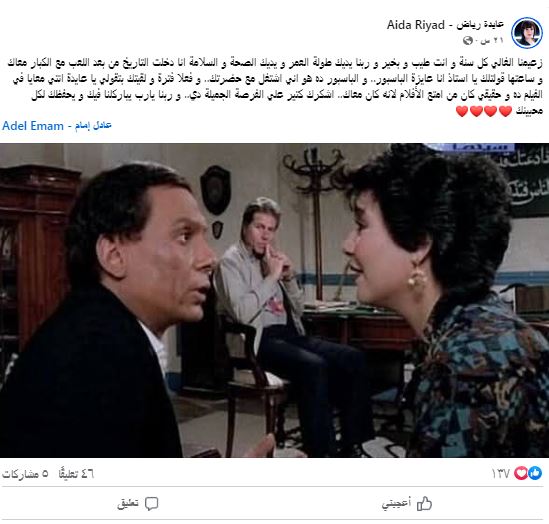 وكتبت عايدة رياض عبر صفحتها الرسمية "فيس بوك": «زعيمنا الغالي كل سنة و انت طيب و بخير وربنا يديك طولة العمر ويديك الصحة والسلامة انا دخلت التاريخ من بعد اللعب مع الكبار معاك وساعتها قولتلك يا استاذ انا عايزة الباسبور.. والباسبور ده هو اني اشتغل مع حضرتك».