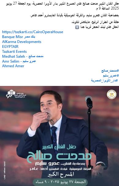 و روج المطرب مدحت صالح عبر حسابه الرسمي بموقع تبادل الفيديوهات والصور "نستجرام" للحفل المقرر وكتب " مستنيكم إن شاء الله يوم الجمعة ٢٧ يونيو على المسرح الكبير بدار الأوبرا المصرية في ليلة طربية جديدة بصحبة الفنان عمرو سليم والفرقة الموسيقية بقيادة المايسترو أحمد عامرهنغني مع بعض من القلب كعادتنا بحبكم ".