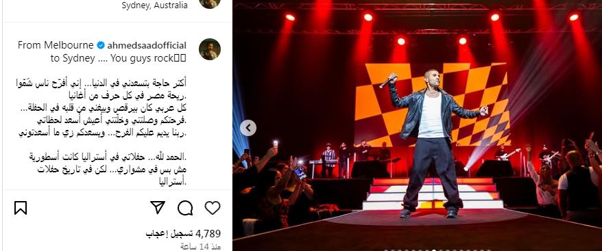 عبر المطرب أحمد سعد عن سعادته وذلك بعد إحياء حفله باستراليا الأحد مشيرا إلي أنها كانت أسطورية في تاريخ حفلات استراليا .