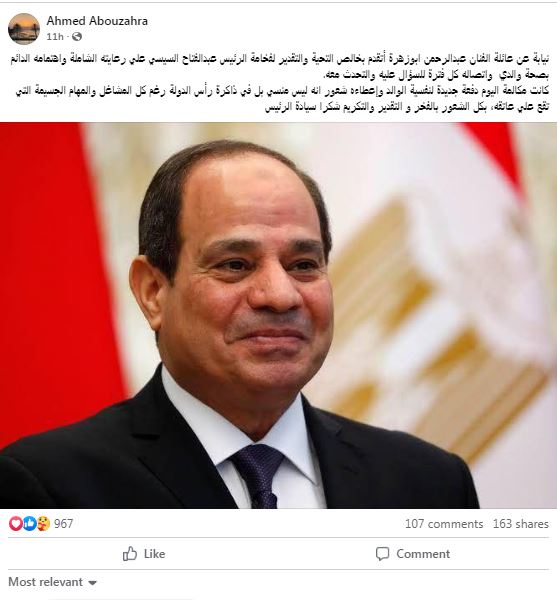 وكتب نجل الفنان عبر صفحته الرسمية فيسبوك "نيابة عن عائلة الفنان عبدالرحمن أبو زهرة أتقدم بخالص التحية والتقدير لفخامة الرئيس عبدالفتاح السيسي على رعايته الشاملة واهتمامه الدائم بصحة والدي واتصاله كل فترة للسؤال عليه والتحدث معه.