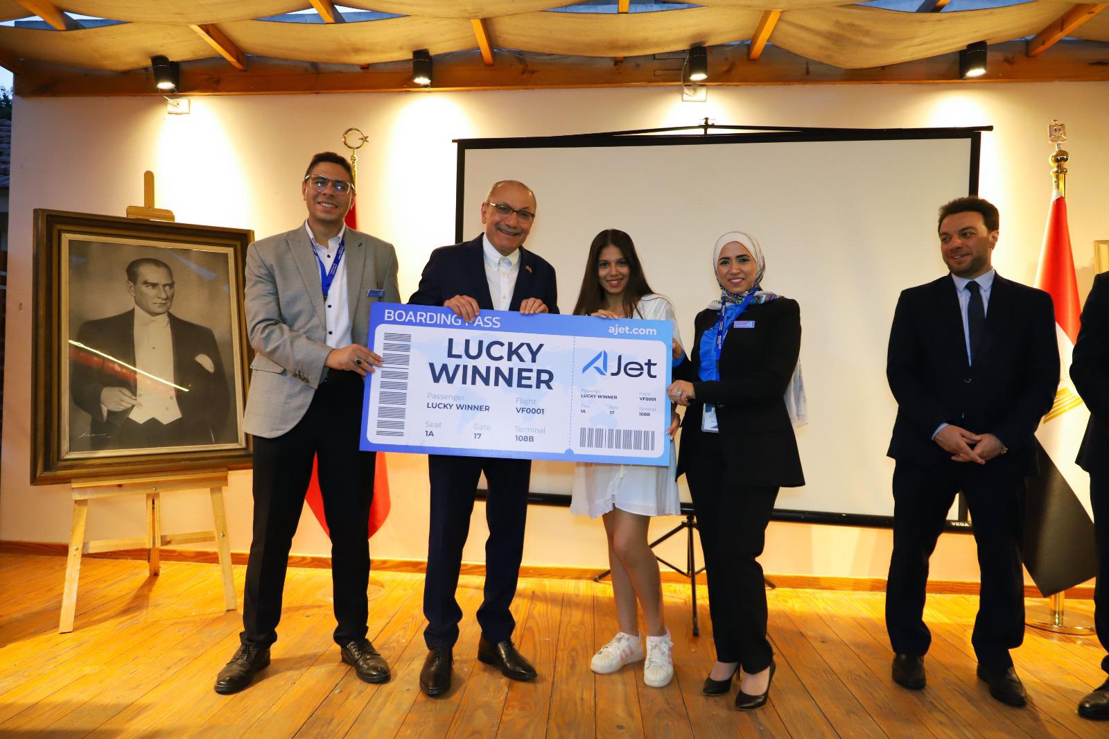 وفي ختام الحفل تم إجراء سحب على 3 تذاكر طيران مقدمة كهدية من شركة A Jet وفاز بالسحب شابتين مصريتين وفتاة فلسطينية.