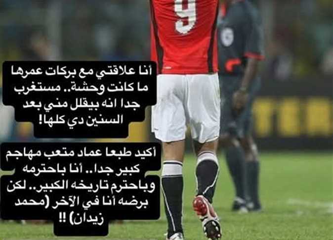 رد النجم المصري السابق، محمد زيدان، على التصريحات التي صرح بها زميله السابق محمد بركات، والتي أكد فيها أن عماد متعب هو أفضل مهاجم لعب بجواره، متفوقًا على زيدان، وهي التصريحات التي اعتبرها الأخير تقليلاً من شأنه ومسيرته الكروية.