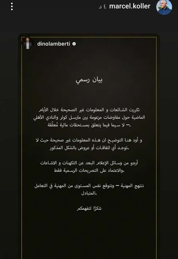 نفى دينو لامبرتي، وكيل أعمال المدير الفني السويسري السابق لفريق الأهلي، مارسيل كولر، بشكل قاطع وجود أي مفاوضات مع النادي الأحمر بخصوص الشرط الجزائي المتعلق بقيمة ما تبقى من عقد المدرب.