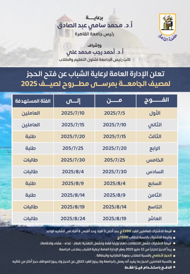 جامعة القاهرة تفتح الحجز لمصيف مطروح: 10 أفواج للعاملين والطلاب بتكلفة رمزية
